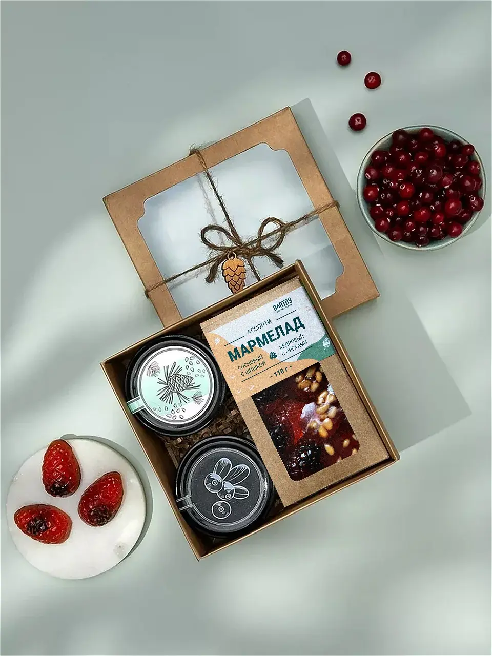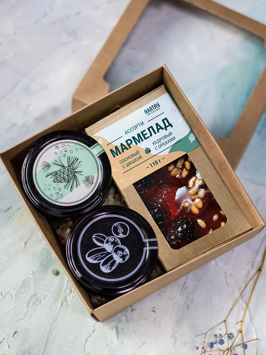 Варенье из сосновых шишек с кедровым орехом - 100 мл; Клюква в сосновом сиропе - 100 мл; Мармелад с сосновой шишкой - 110 гр |